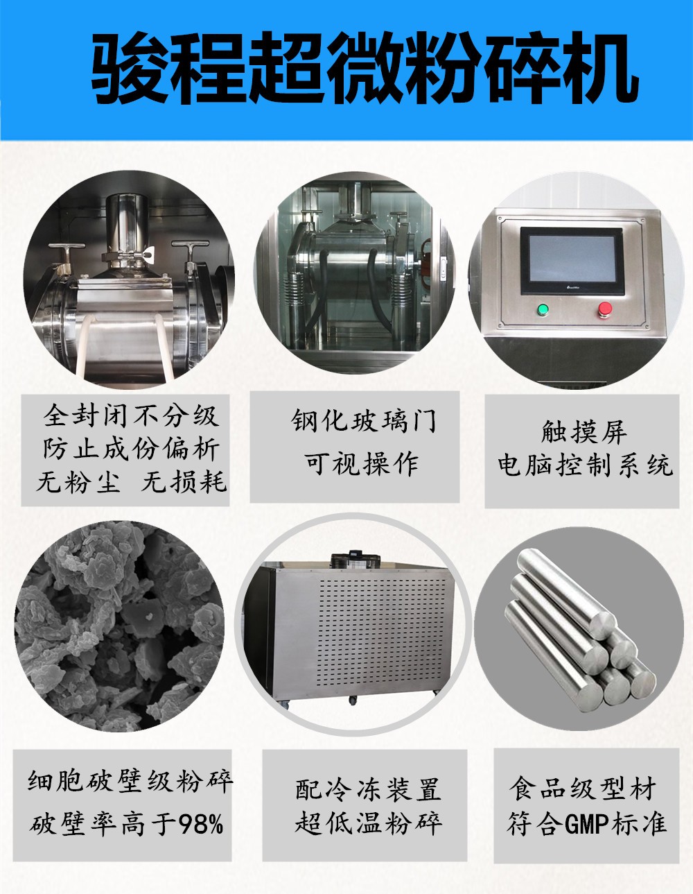 振動式中藥超微粉碎機(jī)可以通過調(diào)節(jié)振動的振幅、振動頻率、介質(zhì)類型實現(xiàn)超微粉碎為目的或以精密混煉(分散乳化)為主要目標(biāo)的作業(yè)。駿程超微粉碎機(jī)采用全密閉多磨不篩技術(shù),可更好的保存藥效成份,有效避免產(chǎn)生藥效成份偏析和損失、因粉塵溢出而污染環(huán)境等現(xiàn)象。磨腔設(shè)有冷卻閉路循環(huán)系統(tǒng),配有制冷系統(tǒng),在低溫狀態(tài)下進(jìn)行粉碎,粉碎過程無過熱現(xiàn)象,可使升溫后軟化或發(fā)粘的藥物易于粉碎。低溫粉碎有利于保留粉體生物活性成分,以利于制成所需的高質(zhì)量產(chǎn)品。
